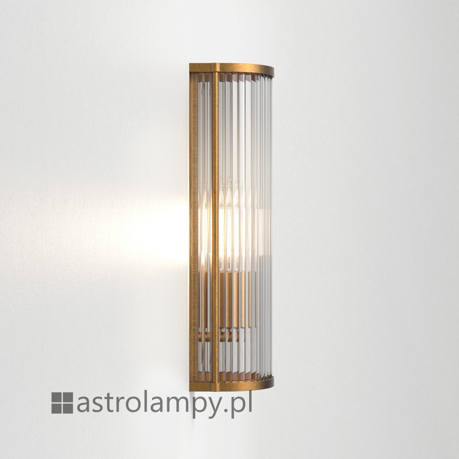 Astro AVIGNON ROUND 375 1427002 to wewnętrzna lampa ścienna o klasie szczelności IP20, inspirowana sztuką secesyjną. Oprawa o półokrągłym kształcie wykonana jest z błyszczących prętów z przeźroczystego szkła z metalowymi końcówkami w kolorze antycznego mosiądzu. Źródłem światła jest żarówka LED E27 o max. mocy 12W. Kinkiet sprawdzi się w przestrzeniach prywatnych jak i komercyjnych, dodając wnętrzu wyjątkowości.
