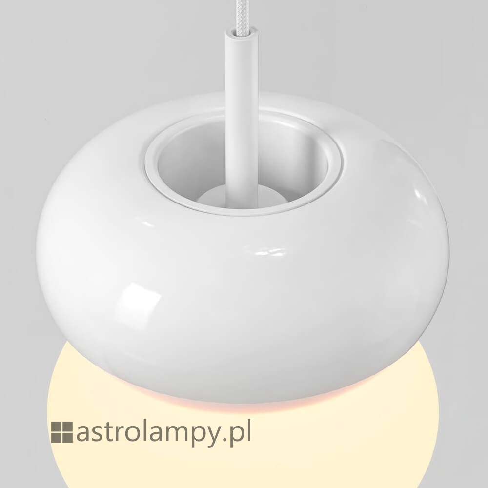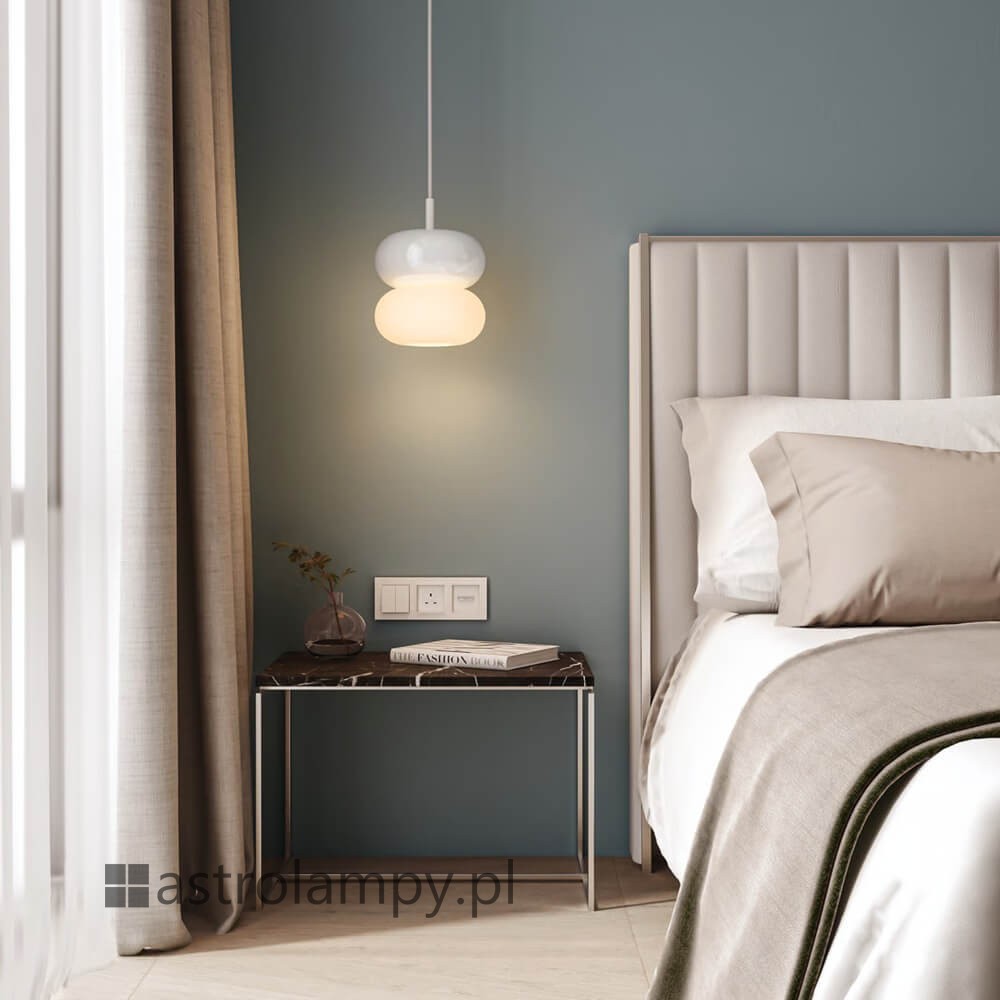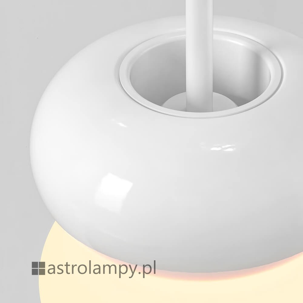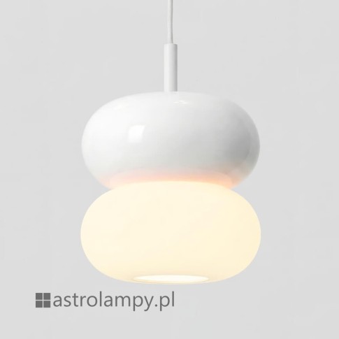 Astro Duo 210 5048001 to elegancki klosz dekoracyjny, który wnosi do wnętrza wyrafinowaną prostotę i szlachetny balans materiałów. Zestawienie błyszczącej, białej osłony z ręcznie dmuchanym, opalowym szkłem tworzy kompozycję nowoczesną, a jednocześnie miękką w odbiorze. Zaokrąglona sylwetka sprawia, że model prezentuje się lekko i harmonijnie, a po włączeniu światła buduje ciepłą, nastrojową atmosferę, idealną do jadalni, strefy nad blatem, wyspy kuchennej czy eleganckiego wnętrza komercyjnego.
