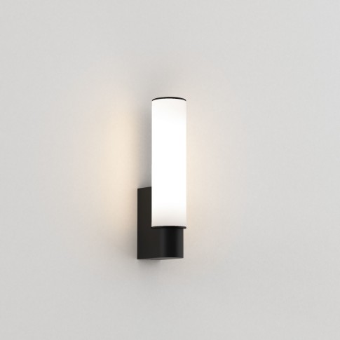 Astro KYOTO LED 1060017 to lampa łazienkowa w kształcie walca, wykończona  w kolorze czarnym, z dyfuzorem z białego opalizującego szkła. Źródłem światła jest LED o mocy 8,8W i ciepłej barwie światła 2700K. Klasa szczelności IP44 pozwala na stosowanie oprawy w łazienkach w strefach: 2 i 3 oraz innych miejscach o podwyższonej wilgotności. Matowe wykończenie i kształt walca sprawiają, że lampa doskonale komponuje się z różnymi rodzajami wykończenia łazienki.