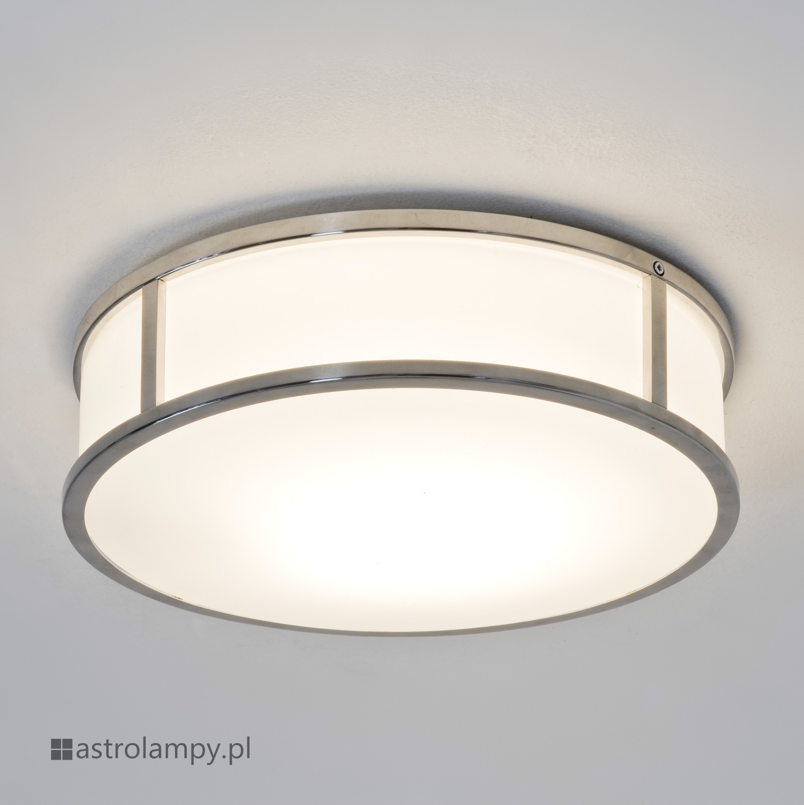 Okrągły plafon sufitowy Astro MASHIKO ROUND 300 1121017 . Wykonana z metalu w kolorze polerowanego chromu oraz szkła mlecznego jest atrakcyjną propozycją do łazienek i innych pomieszczeń o podwyższonej wilgotności. Okrągła forma sprawia, że pasuje ona właściwie do każdego wnętrza, a klasa szczelności IP44 umożliwia stosowanie jej w łazienkach w strefach: 2 i 3 oraz innych miejscach o podwyższonej wilgotności, gdzie wymagane jest zastosowanie opraw IP44. Źródłem światła jakie wykorzystuje oprawa jest żarówka E27 o mocy max. 60W. Oprócz tradycyjnych żarówek żarnikowych można stosować żarowki energooszczędne lub żarówki LED E27. Jest to ciekawa propozycja, która sprawdzi się jako oświetlenie korytarza lub klatki schodowej.