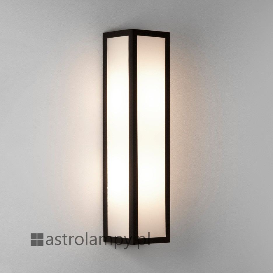 Astro SALERNO 1178009 to zewnętrzna lub wewnętrzna lampa ścienna o geometrycznym kształcie. Wykończona jest w kolorze czarnym z obudową z białego opalizującego szkła. Lampa posiada podwyższony stopień szczelności IP44, który umożliwia montaż wewnątrz i na zewnątrz budynków, oraz w miejscach o podwyższonej wilgotności. Oprawa jako źródło światła wykorzystuje dwie żarówki E14 o mocy max. 40W każda (brak w zestawie). Tradycyjne źródło światła można wymienić na żarówkę energooszczędną lub LED, które w dłuższej perspektywie czasu dają wymierne oszczędności. Lampa posiada zintegrowany ściemniacz. Dzięki swojej smukłej sylwetce i zawsze modnym czarnym kolorze, lampa SALERNO może stać się ciekawym elementem dekoracyjnym. Może ona również w ciekawy sposób oświetlać dom lub ogród.